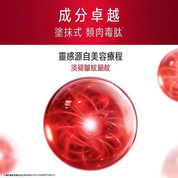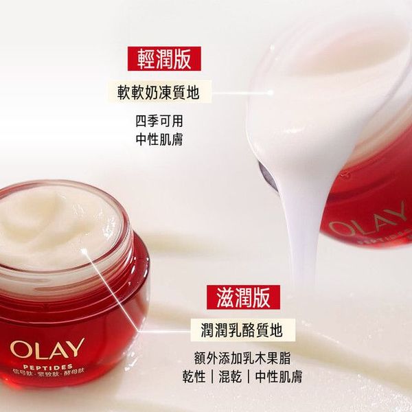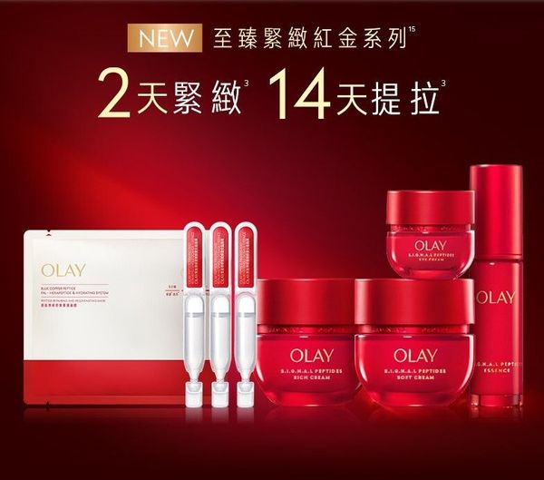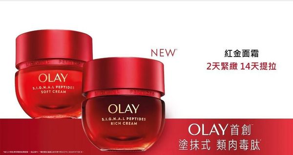 - OLAY專研專櫃級成分Peptide胜肽50年,紅金面霜-加入首創塗抹式「類肉毒肽"」重磅成分﹐Signal Peptide訊號肽組合`突破性激活3大抗老蛋白^,令法令紋減淡、蘋果肌更豐盈、下顎線更清晰。