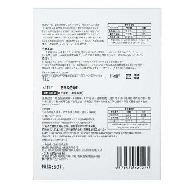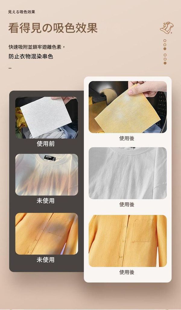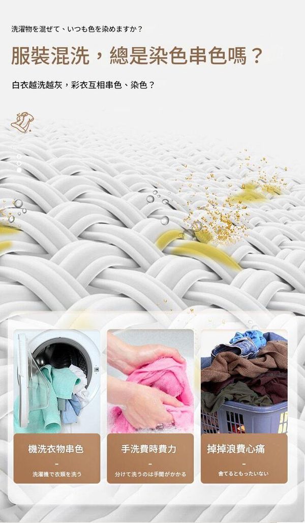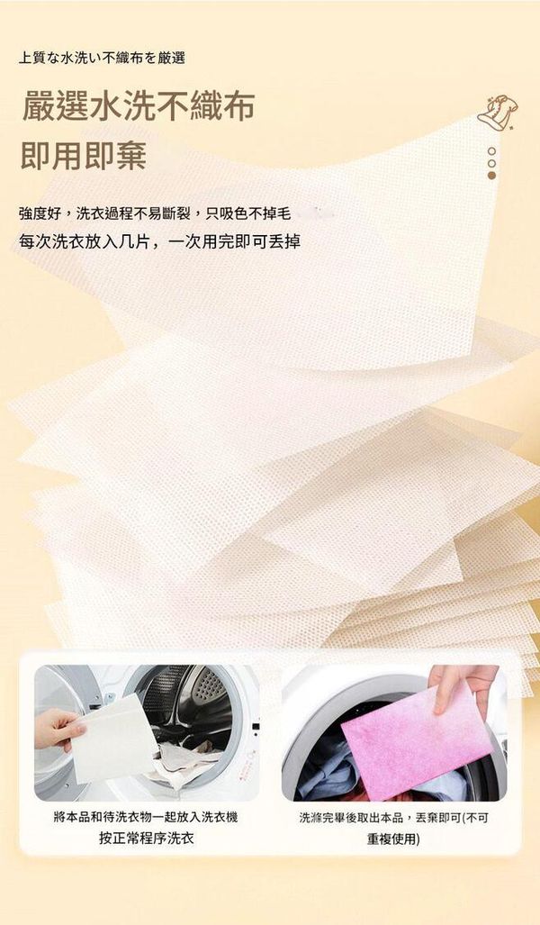 強效吸色,防止洗衣時白色衣物與其他顏色串染,不傷衣物
