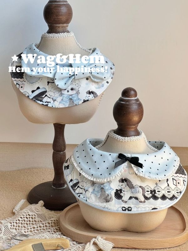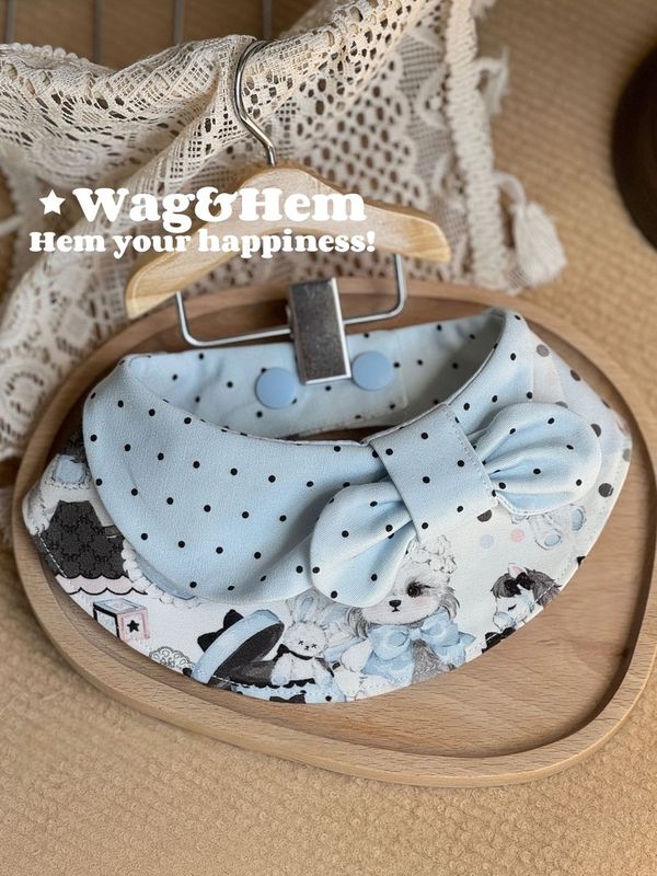 自家品牌生產 WAG & HEM 「童話馬戲團」口水巾,以淺藍波點與萌趣插畫為主題,帶來 蝴蝶結領結款 和 荷葉邊領結款 兩種造型,讓毛孩子的每一次出門,都像走進溫柔童話~