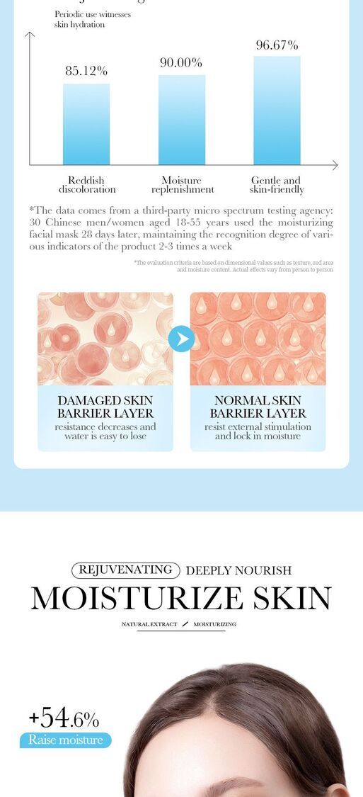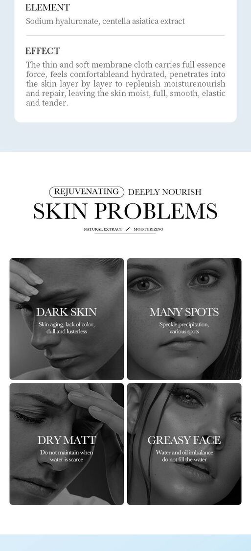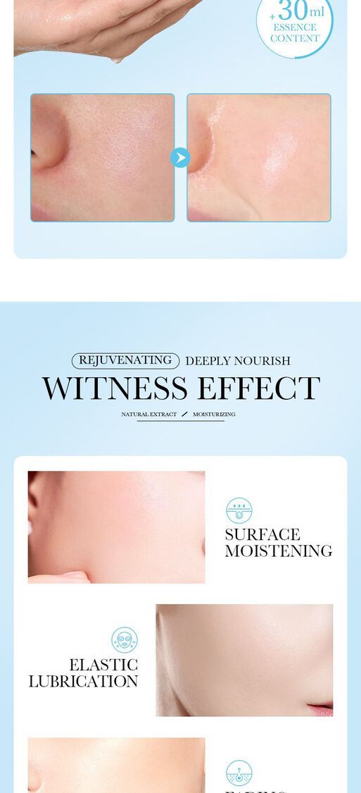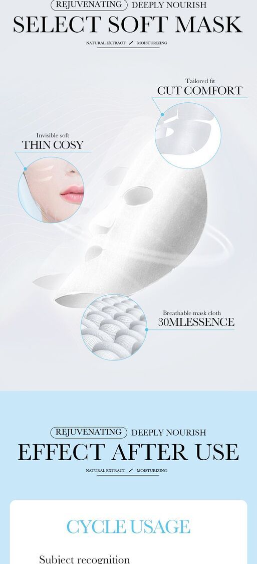 功效:薄軟的膜布承載滿滿精華力,使用時感覺舒適且水潤,能層層滲透至肌膚,補充水分、滋養並修護,令肌膚水潤、飽滿、光滑、富有彈性且柔嫩。
