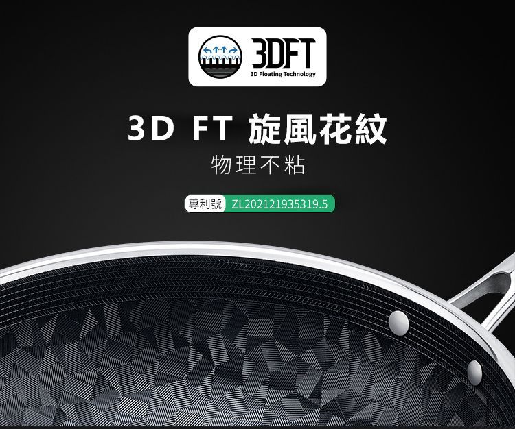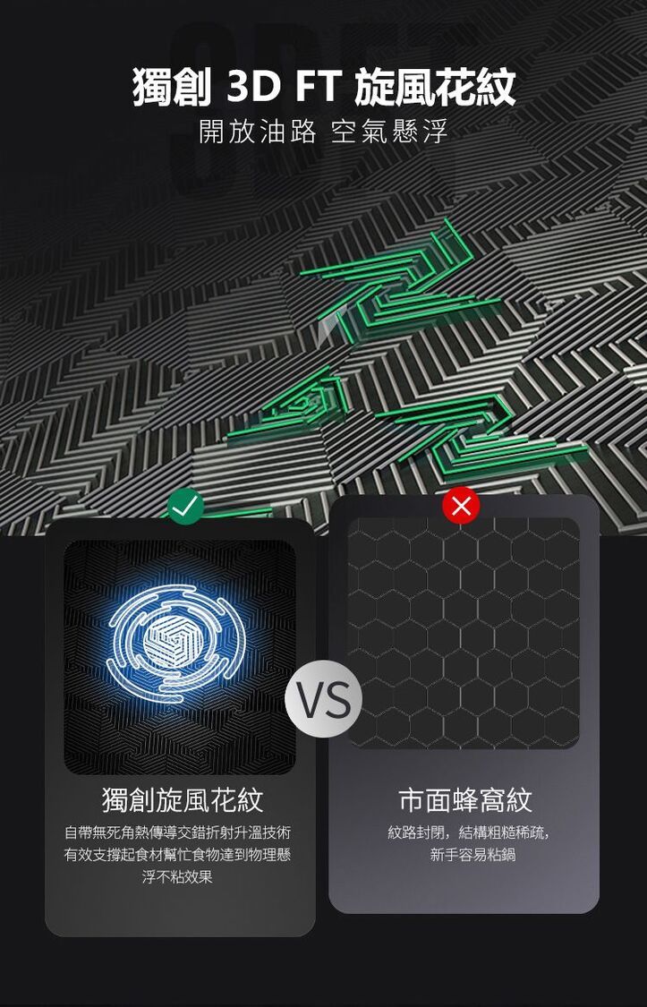 ・獨創旋風菱形花紋,開放油路不沾不糊