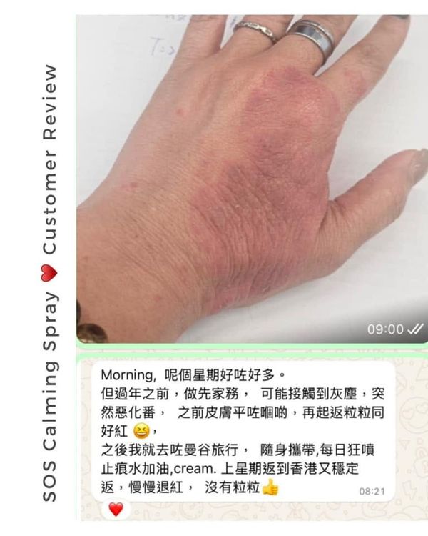 一般敏感痕癢:將SOS 奇蹟舒敏修復水 噴灑在敏感肌膚上有助於加強保濕緩解痕癢。