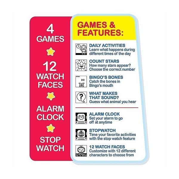 三個遊戲、12個鐘面、一個鬧鐘和一個秒錶來鼓勵早期學習。教育遊戲包括「數星星」、「抓骨頭」和「猜猜動物的聲音」。與孩子一起玩耍可以加深親子之間的聯繫,獲得新的體驗,並透過參與式遊戲培養核心學習和社交技能。設定日常習慣和提醒是個好主意。透過設定起床、穿衣、刷牙、運動和睡覺的時間,讓您的孩子能夠管理自己的時間和日程安排。這款互動玩具手錶可以培養運動技能、閱讀和口語、認知學習、社交情緒技能和創造力。這款手錶非常適合外出時佩戴,採用兒童友好型設計,並配有時尚的可定製錶帶,確保佩戴舒適,適合小手腕。建議3至8歲兒童配戴。電池:一顆CR2450紐扣鋰電池(內含測試電池)。請注意:由於本產品為進口產品,包裝可能有輕微刮痕或磨損。