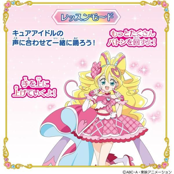 “接力棒模式”,您可以欣賞偶像光之美少女不斷變化的燈光顏色和線條;有可以跟著Cure偶像們的聲音跳舞的“課程模式”和可以揮動指揮棒預測命運的“占卜模式”。【套裝內容】- 光之美少女舞台專用絲帶1個- 光之美少女舞台專用絲帶1個【所需電池】3節7號電池(另售)(本商品除套裝內容外,其他所有商品均為另售。)