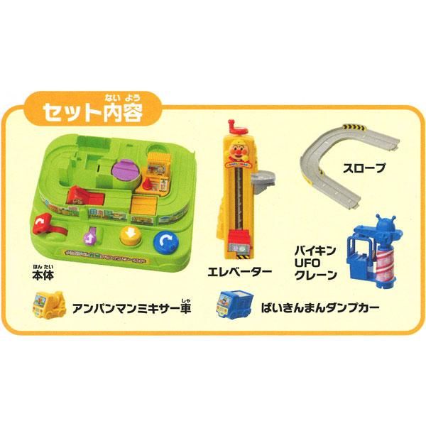 主機 x 1、升降機 x 1、斜坡 x 1、白金UFO起重機 x 1、麵包超人攪拌車 x 1、白金超人翻斗車 x 1