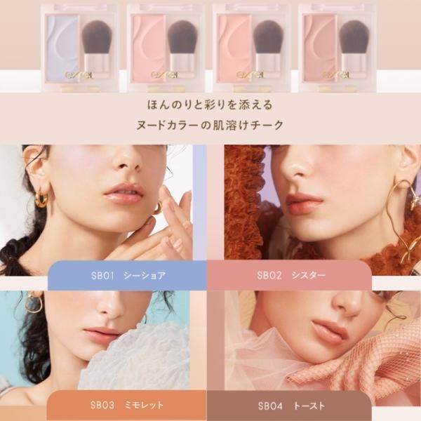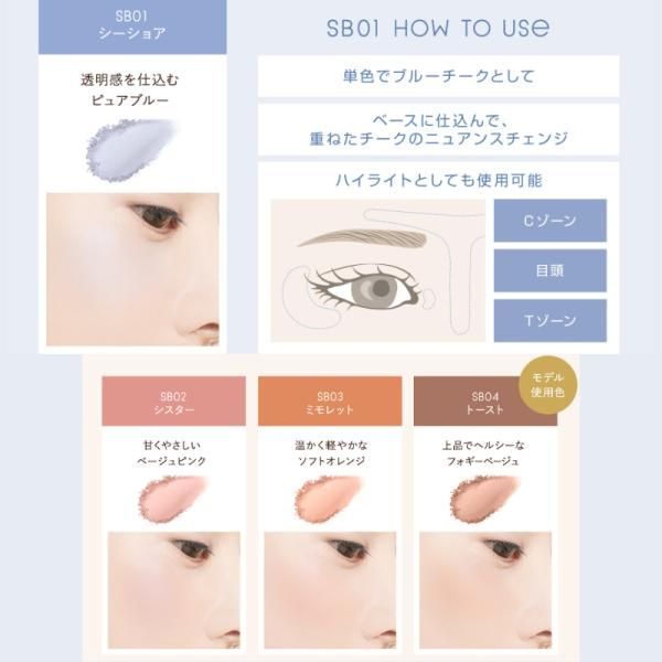 ●SB01 Seashore:純淨的藍色,呈現半透明感 ●SB02 Sister:甜美溫柔的米粉色 ●SB03 Mimolette:溫暖輕盈的柔橙色 ●SB04 Toast:精緻健康的霧米色