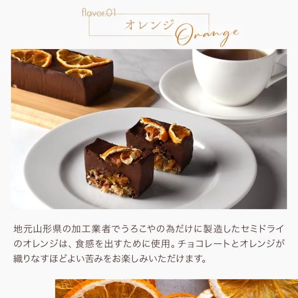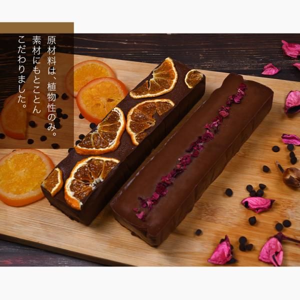 配料:有機可可塊(瑞士製造)、椰奶、橙子、杏仁、小麥粉、有機原糖、有機可可脂、有機可可粉、燕麥片、燕麥奶、甜菜糖、橄欖油、椰子油、楓糖漿、米粉(山形縣產Tsuyahime)。