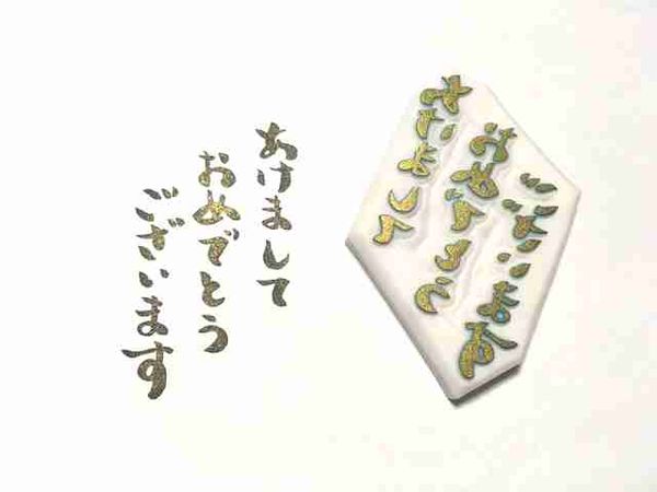 用毛筆寫的「新年快樂」用橡皮印章重現。非常適合新年賀卡。 *圖片顯示的是金色和黑色混合製成的印章。材料資訊:材質:橡皮印圖(「明信片1/2尺寸」或「Horunavi」)顏色:依使用材質而有所不同(白色底色為藍色、黑色底色為白色、白色底色為黃色)印章尺寸:68mm x 43mm 印章尺寸:75mm x 47mm x 10mm ---M