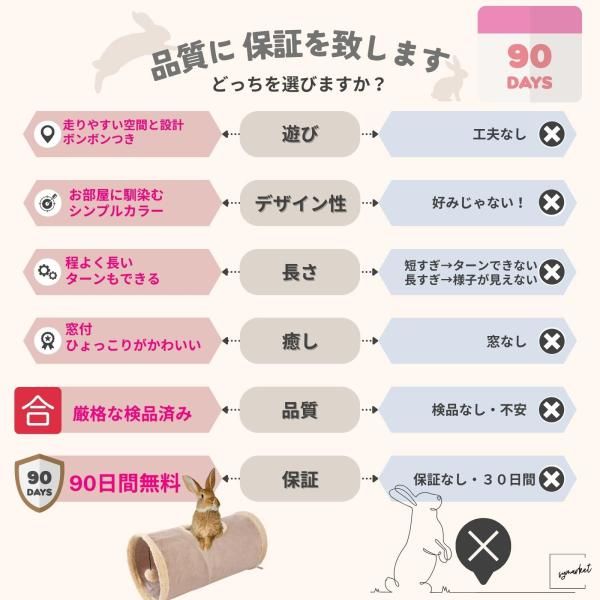 ◆隧道中間的窺視孔一定會讓主人感到高興。 ◆其中一個開口處的蓬鬆絨球會激發您小兔子的好奇心! ◆外層絨面革觸感柔軟,內層聚酯纖維易於清潔。 ◆無論怎麼玩都輕鬆自如!耐用的材質不易變形。 有兩種顏色可選:可愛的馬卡龍粉紅色和沈穩的霧面卡其色。 這些玩具可以用作小動物的玩耍玩具和運動玩具,包括兔子、貓、龍貓和倉鼠。 長 50 厘米,入口直徑 25 厘米,窺視孔 20 厘米。連接兩個可以形成一條長隧道。非常適合幫助您的寵物進行足夠的運動。 可折疊,只需將兩側開口折疊在一起即可緊湊存放或旅行。 【客戶至上】如有任何疑問,請隨時與我們聯絡。我們了解許多人對中國製造的產品品質感到擔憂。因此,我們按照日本標準徹底檢查和控制每一件產品。本產品以簡易包裝折疊出售。
