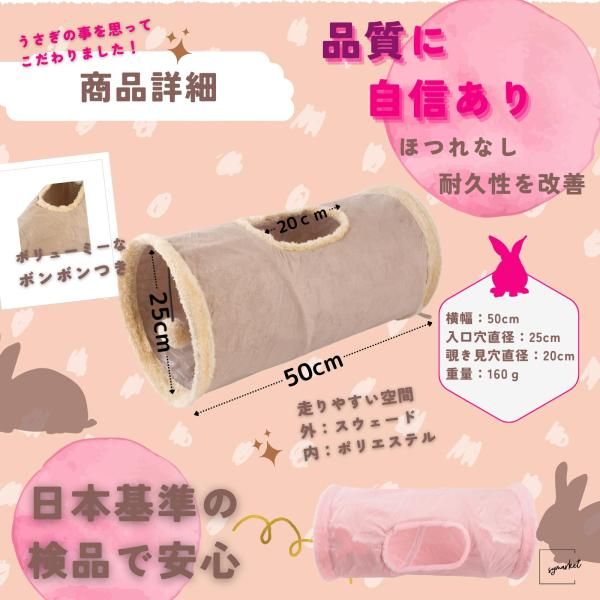 ◆隧道中間有窺視孔,一定會讓主人感到安心。 ◆隧道一端的蓬鬆絨球會激起兔子的好奇心! ◆絨面革外層觸感柔軟,聚酯纖維內裡易於清潔。 ◆無論你的兔子怎麼玩,它都不會在意!耐用的材料不會變形。 ◆有兩種顏色可供選擇:可愛的馬卡龍粉紅色和沈穩的霧面卡其色。 ◆適用於兔子、貓、龍貓、倉鼠和其他小動物。