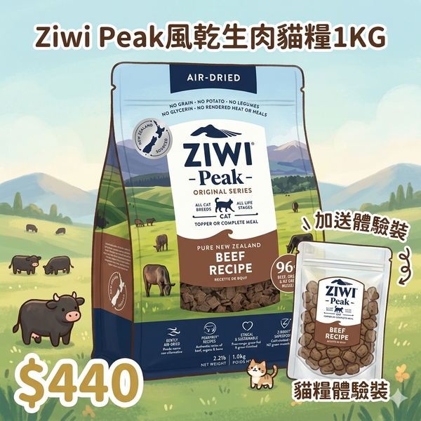 Ziwipeak新西蘭巔峰貓糧 - 風乾脫水 - 無穀物牛肉配方 1kg 香港行貨(BBD:2027年1 至3月 批次隨銷售更新)