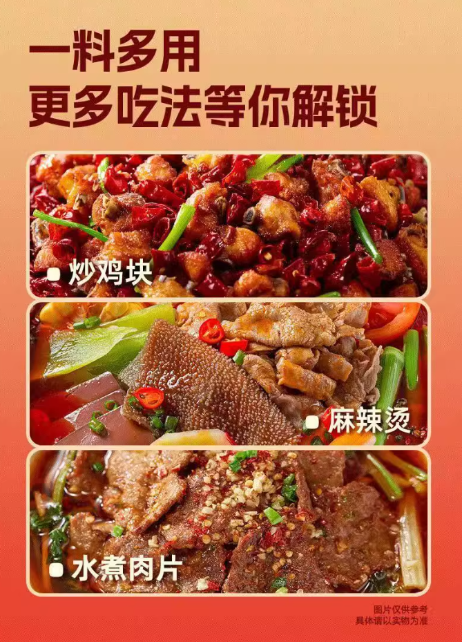 小包裝,更方便。一料多用,吃法多多:炒雞塊、麻辣燙、打邊爐、麻辣香鍋、水煮肉片、家常小炒等菜品
