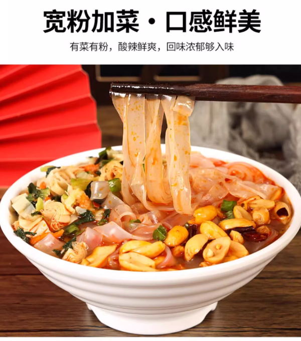 寬粉口感q彈有嚼勁,微辣,酸酸辣辣帶點甜,湯底很好喝,配有豌豆和鍋巴,鍋巴放在湯底裡泡一泡拿出來吃很香!