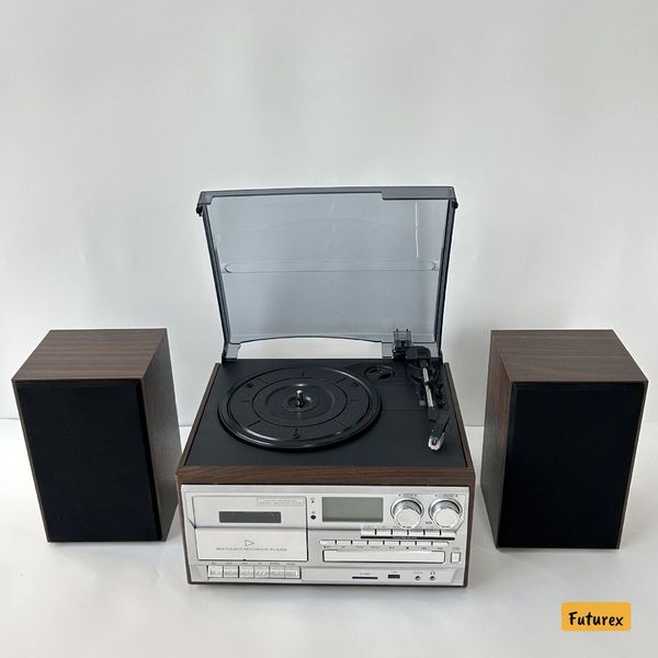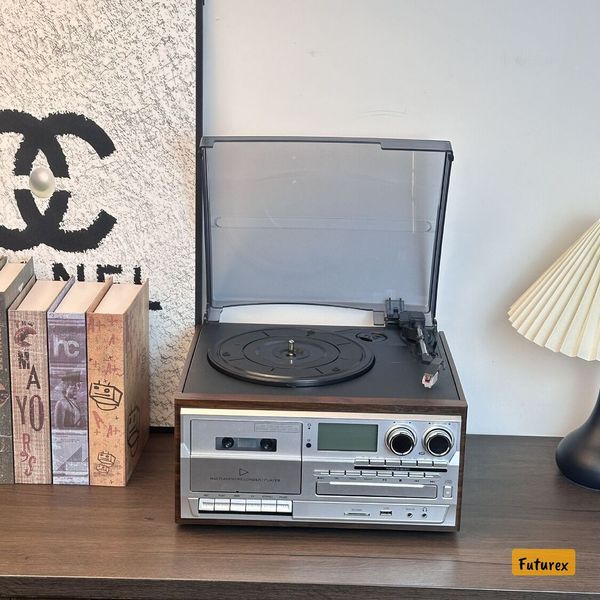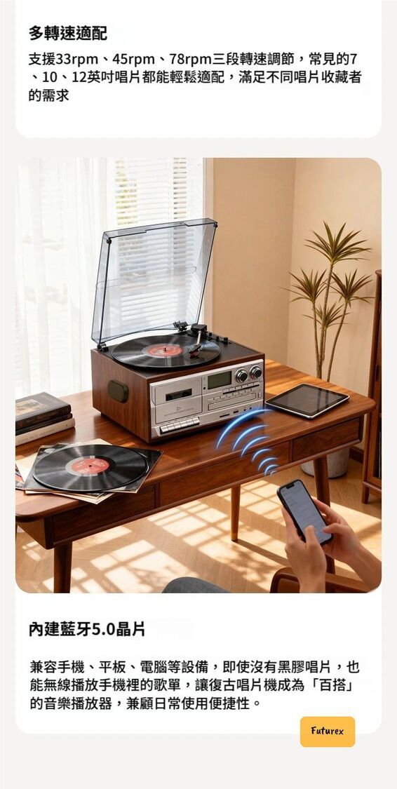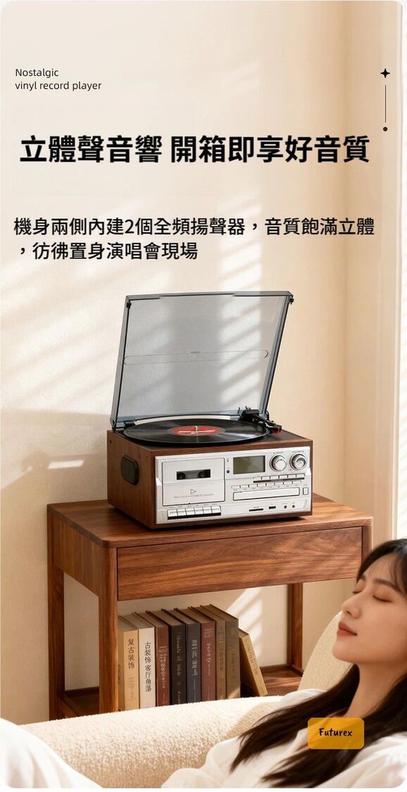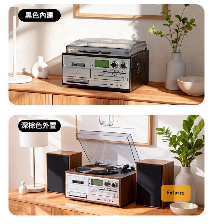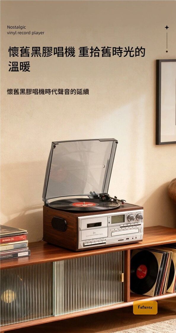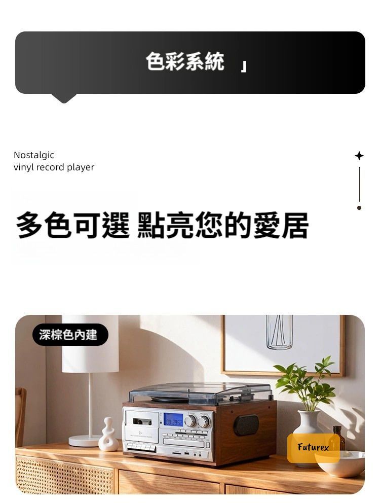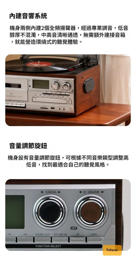 - 7合1多功能音響系統:支援黑膠唱片、CD、磁帶、藍牙5.0、SD卡、USB、FM/AM收音