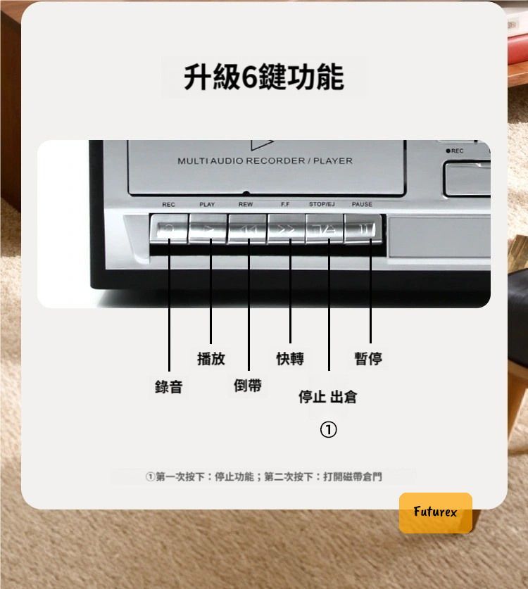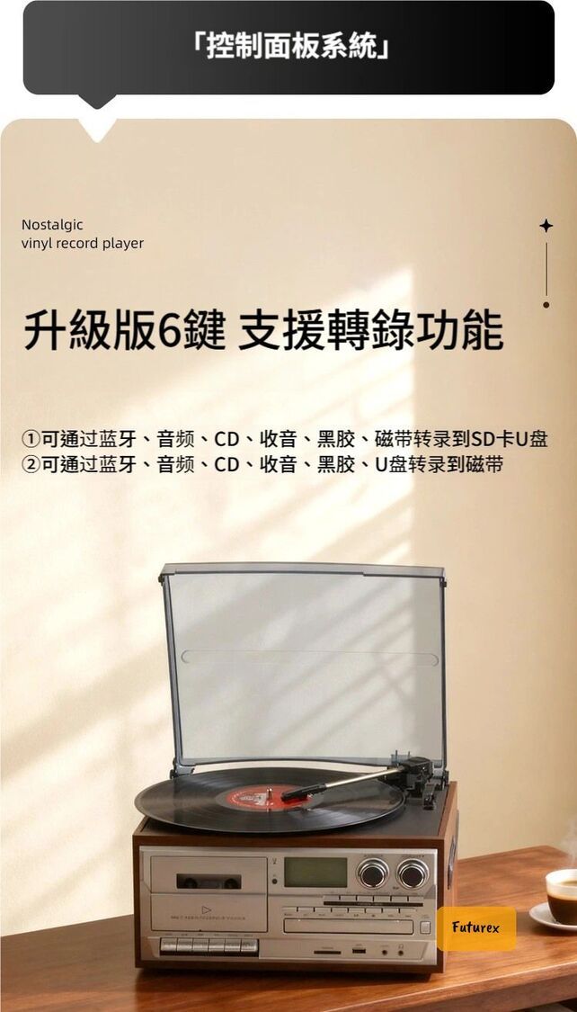 - 升級6鍵磁帶錄音功能,支援藍牙、音頻、CD、收音、黑膠、U盤互相轉錄