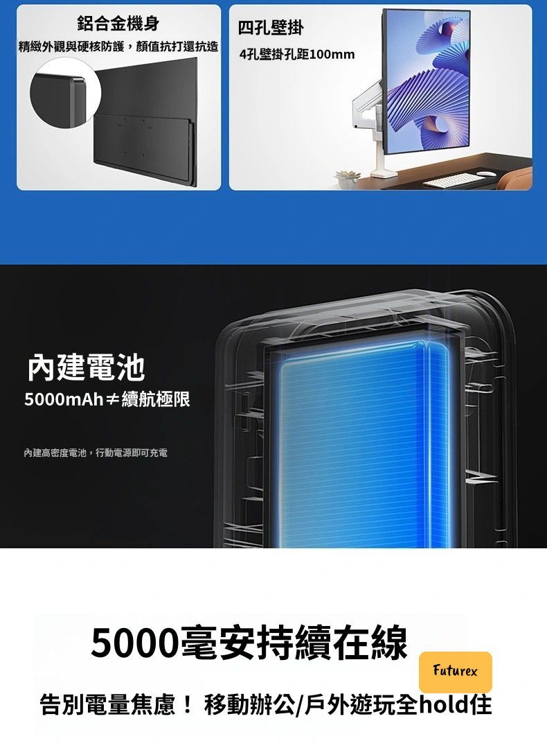 - 接口:HDMI、Type-C(供電及數據)、USB、3.5mm音頻