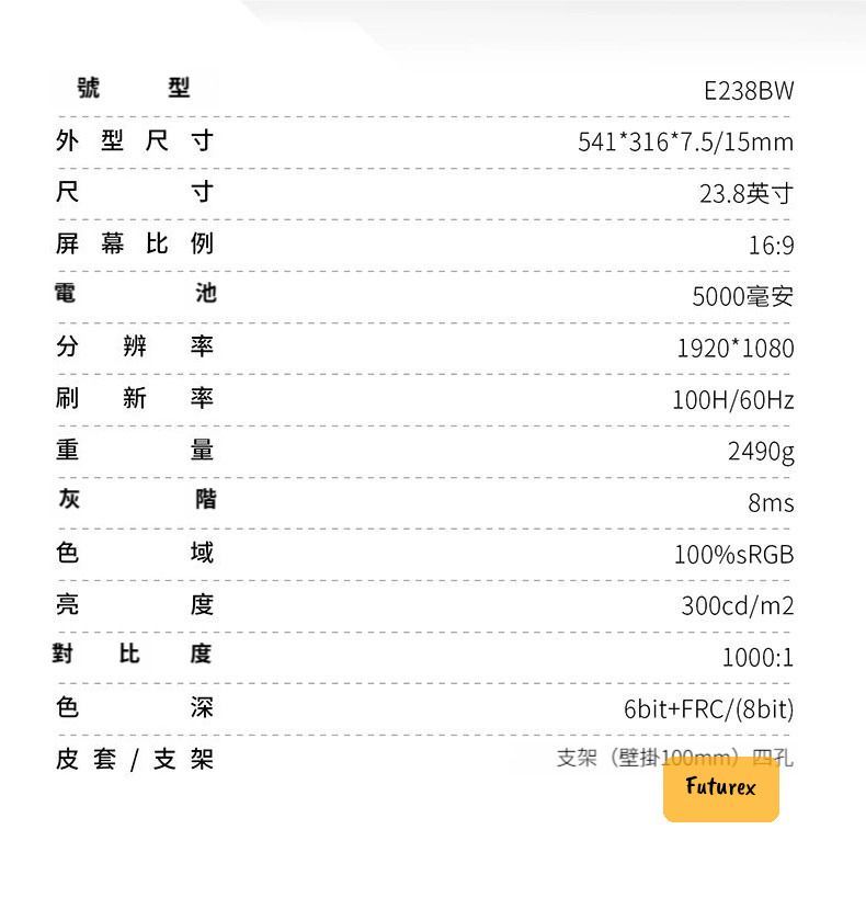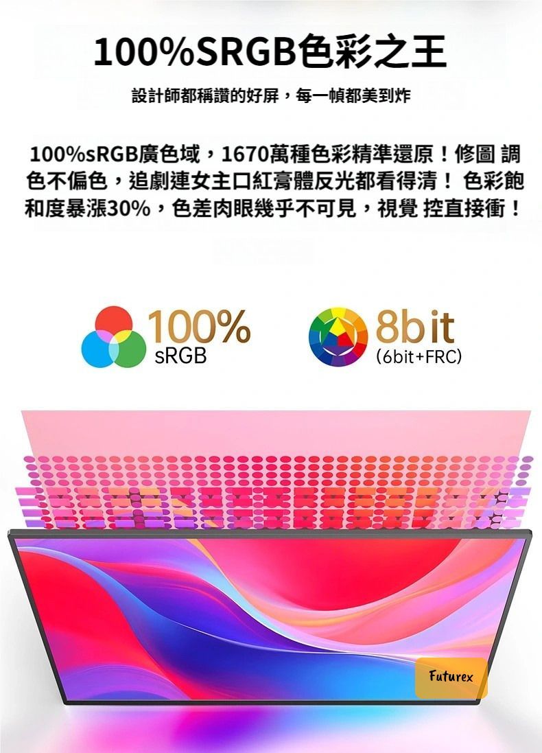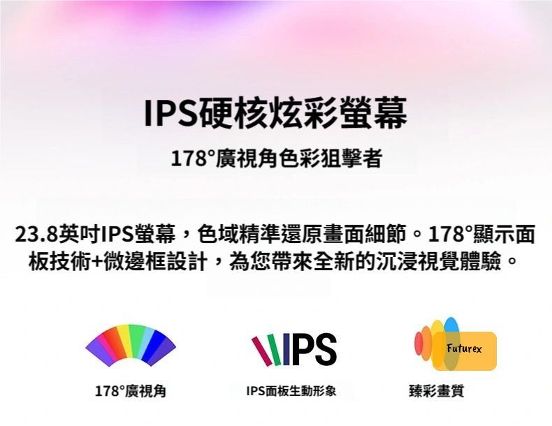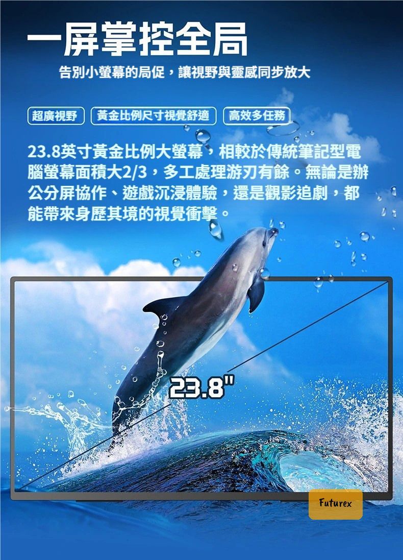 - 23.8吋IPS屏幕,1920x1080解像度,100% sRGB色域,178°廣視角,畫質細膩色彩準確。