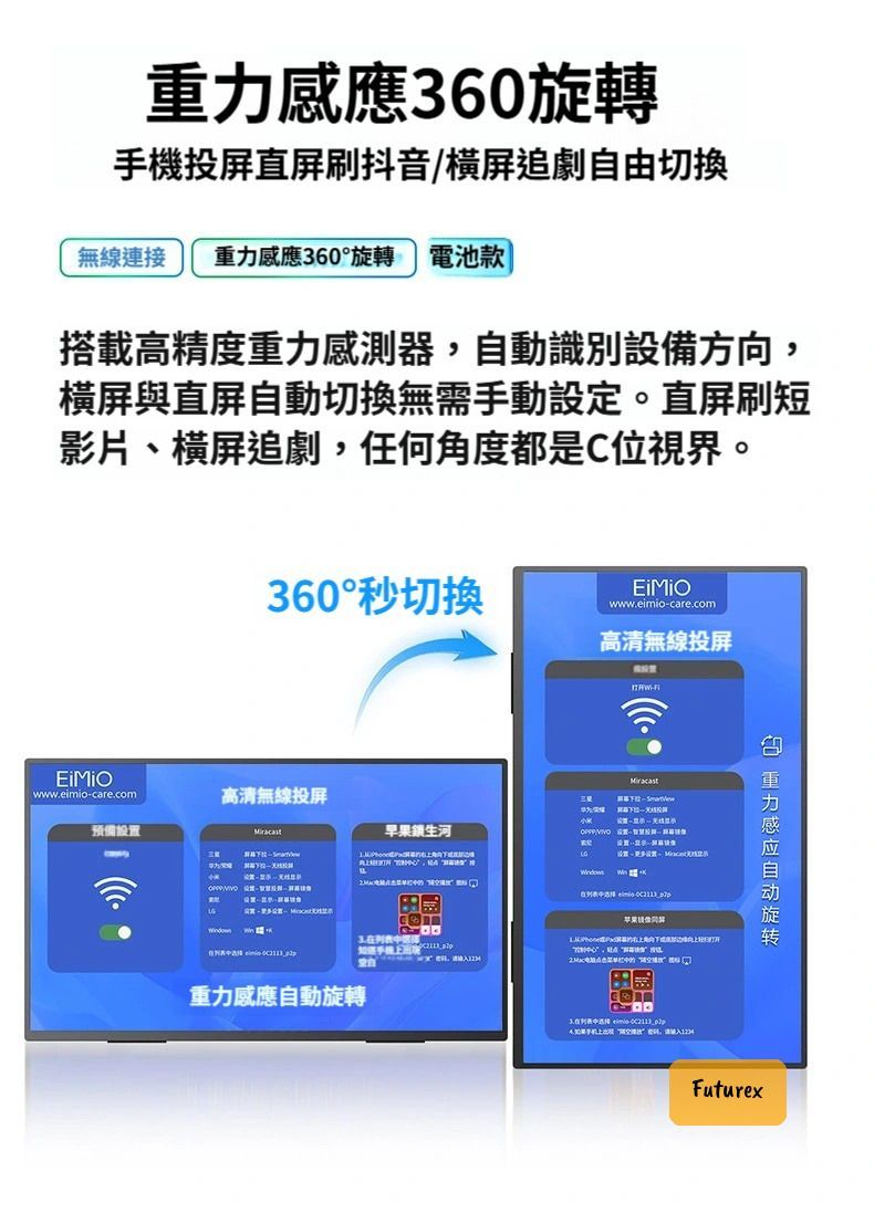 - 無線投屏支援Miracast和AirPlay,兼容iOS、Android、Windows同macOS設備,一鍵連接好輕鬆。