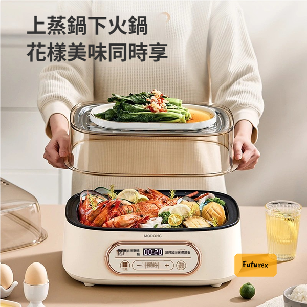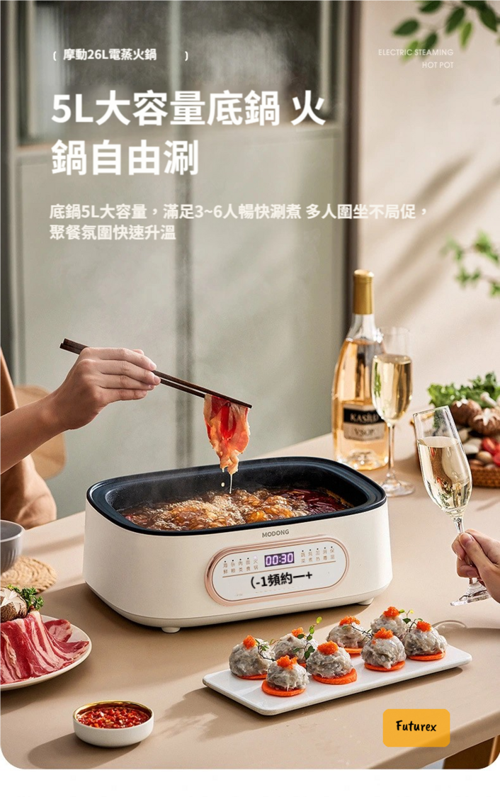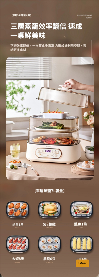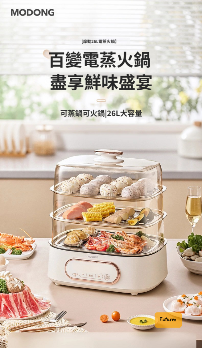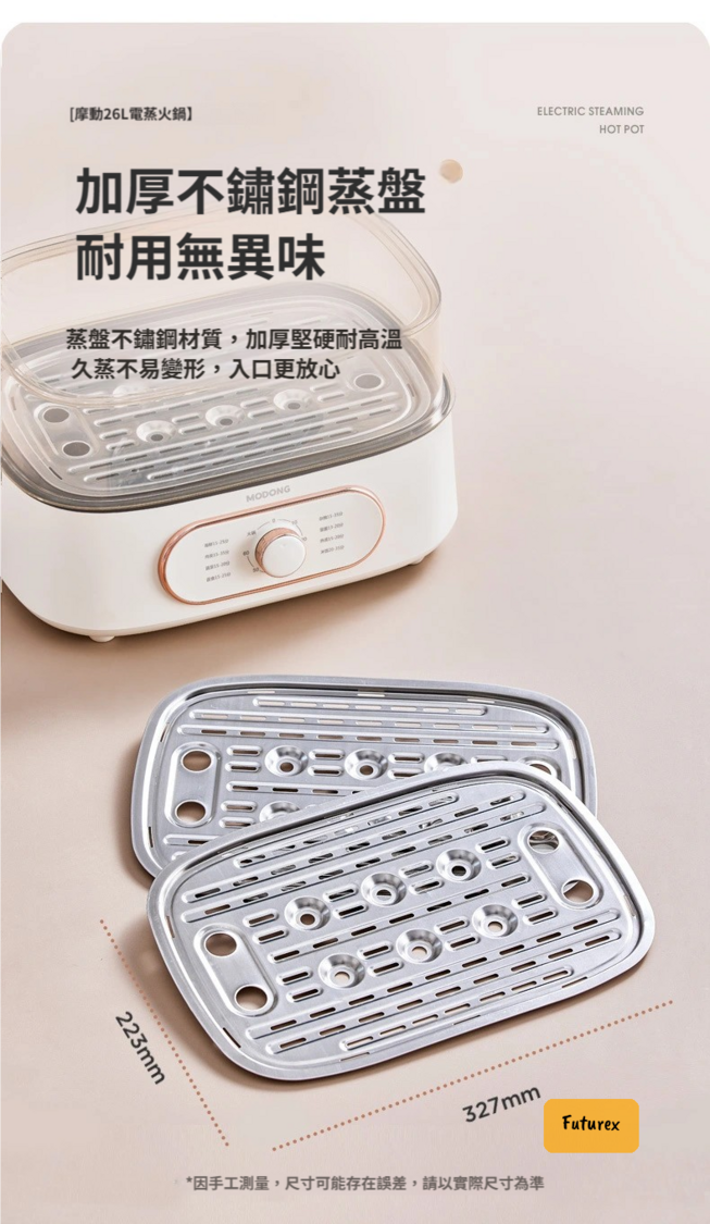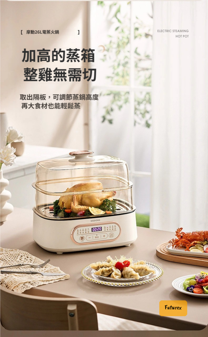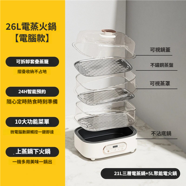 - 26L大容量設計:21L三層蒸鍋+5L火鍋底,6人打邊爐都夠晒位