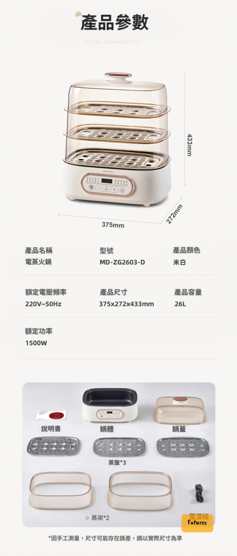 - 配件:3個蒸盤、2個蒸架、電源線(英式插頭)