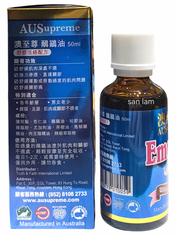 鴯鶓油是由一種與人類皮膚油脂極為相似的不飽和脂肪酸組成,具極強的皮膚滲透力,可迅速直達患處,有效減輕各種肌肉和關節不適等症狀,尤其對運動後引起的肌肉緊繃和痠痛具顯著的緩解功效。獨特的複合配方不同於市面上其他同類產品,澳至尊鴯鶓油採用獨特複合配方,特別加入以下珍貴成份,使效果倍增,從而更快速有效、全面徹底地減低各種肌肉及關節不適症狀: