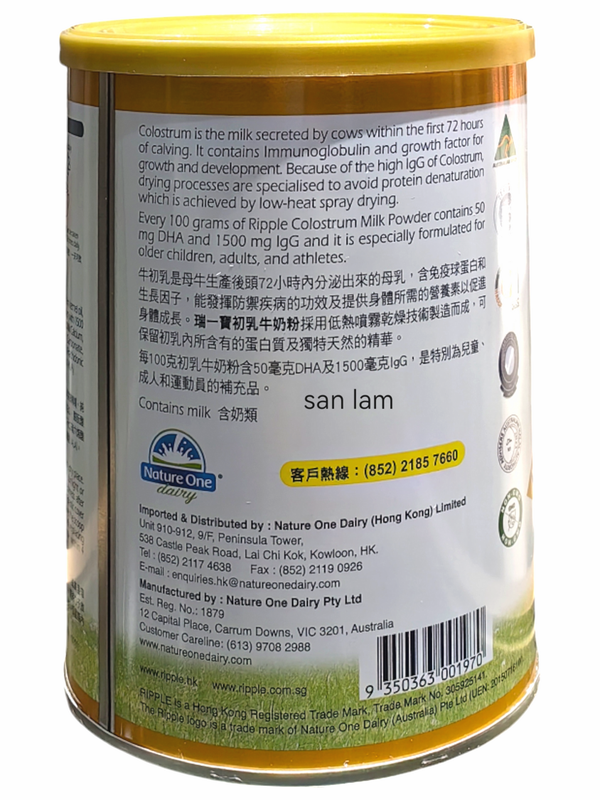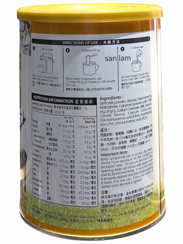 脫脂奶粉、葡萄糖、棕櫚仁油、麥芽糖糊精、純牛初乳粉 (含1500毫克免疫球蛋白G)、酪朊酸鈉、牛奶鈣、