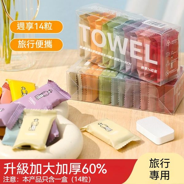 [1盒14粒装]压缩毛巾便携旅行出差洗脸卸妆洁面巾糖果小方巾 一次性洗脸巾 加厚乾湿两用