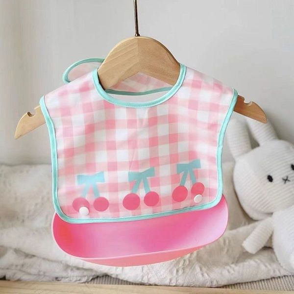 可拆卸宝宝吃饭防口水围兜 - 宝宝吃饭兜防水儿童食饭兜围兜婴儿口水围嘴防脏辅食围饭兜可拆卸-格子樱桃--可拆卸饭兜