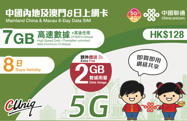 中國聯通-【內地及澳門】8日 9GB (7GB贈送2GB) 高速5G/4G 無限上網卡數據卡電話卡Sim咭 中國大陸數據卡