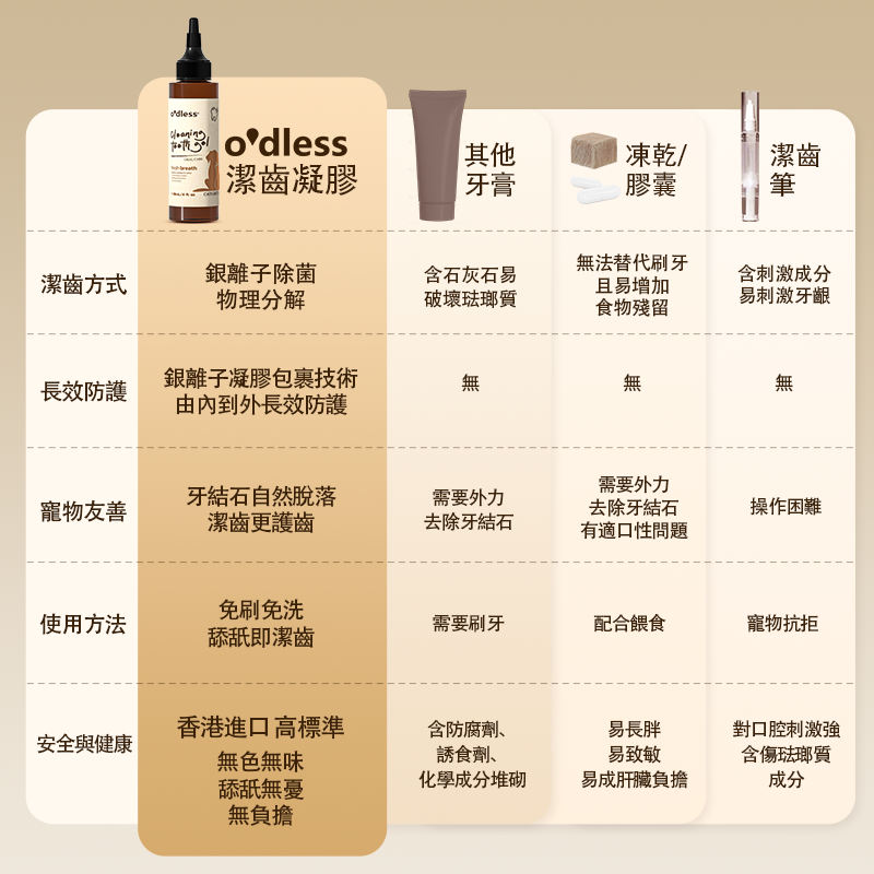 在找寵物潔齒水時,很多主人看重的是方便性。O'dless 保留了「免刷牙」的便利,但在功效上做出了突破: