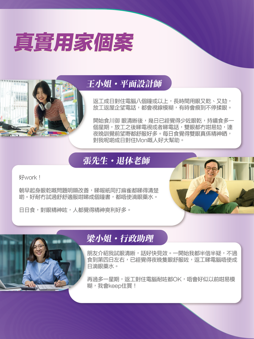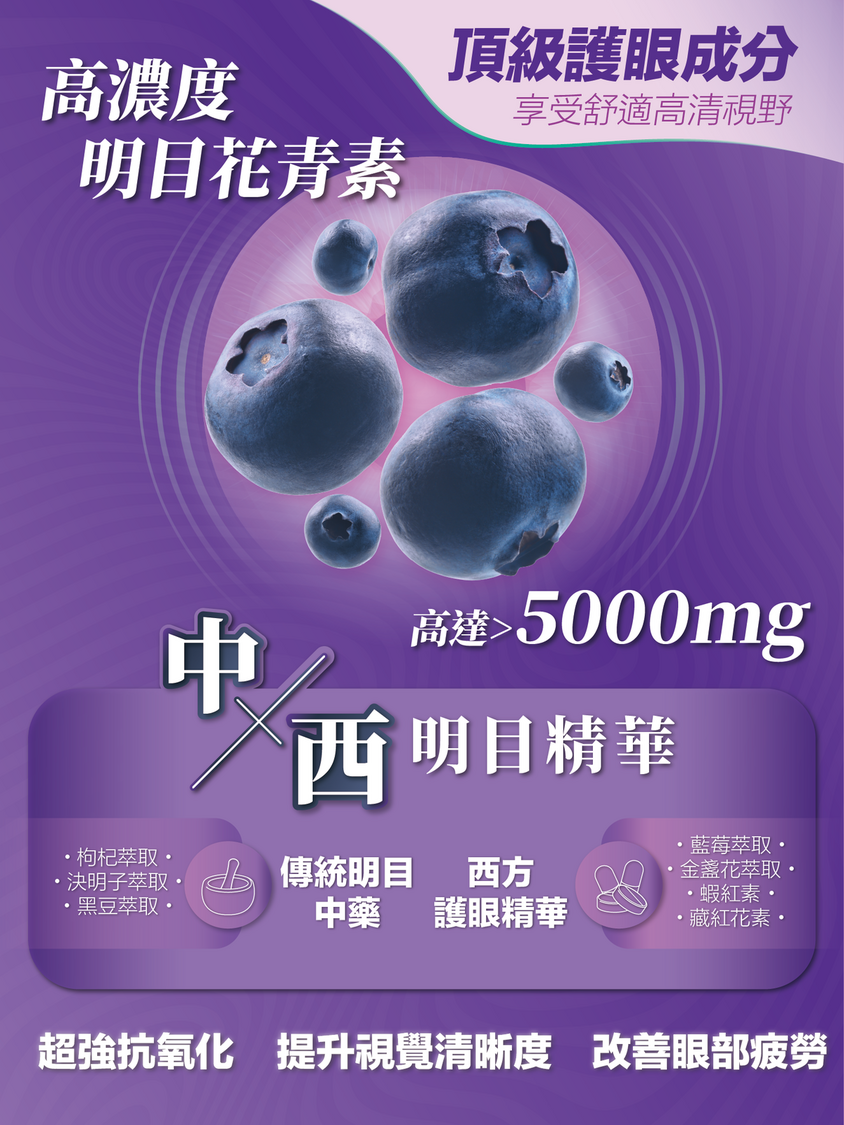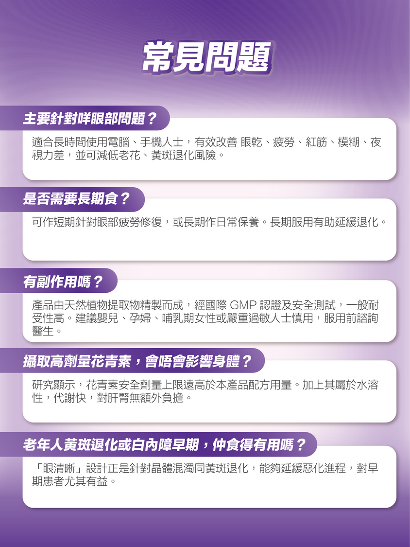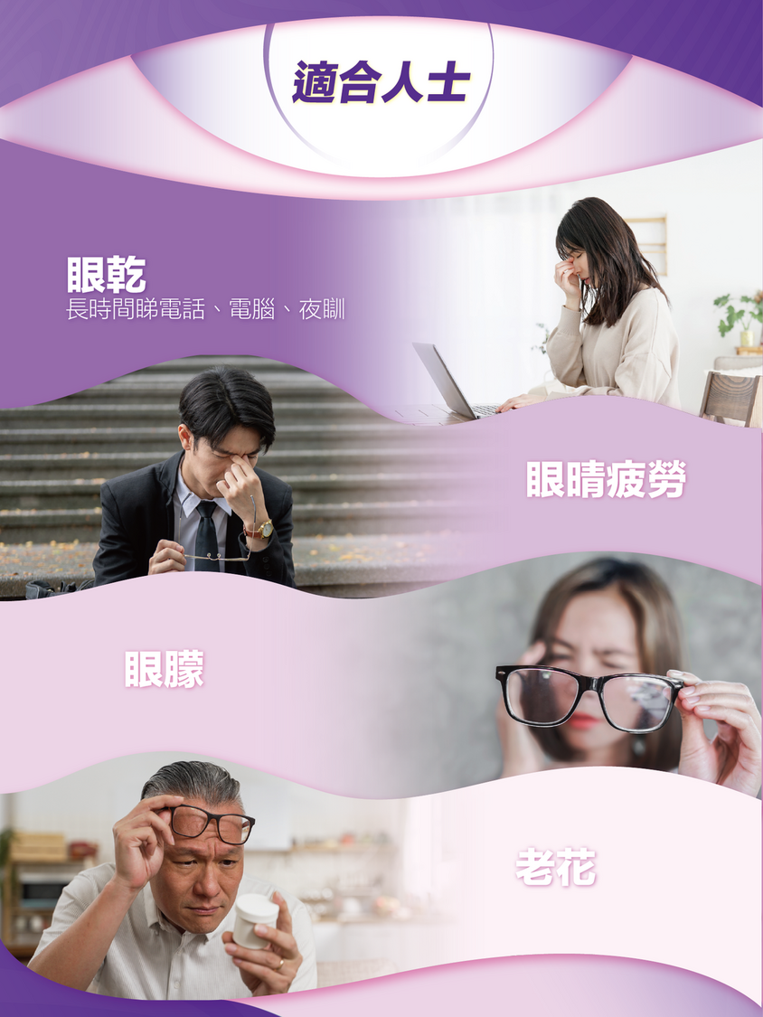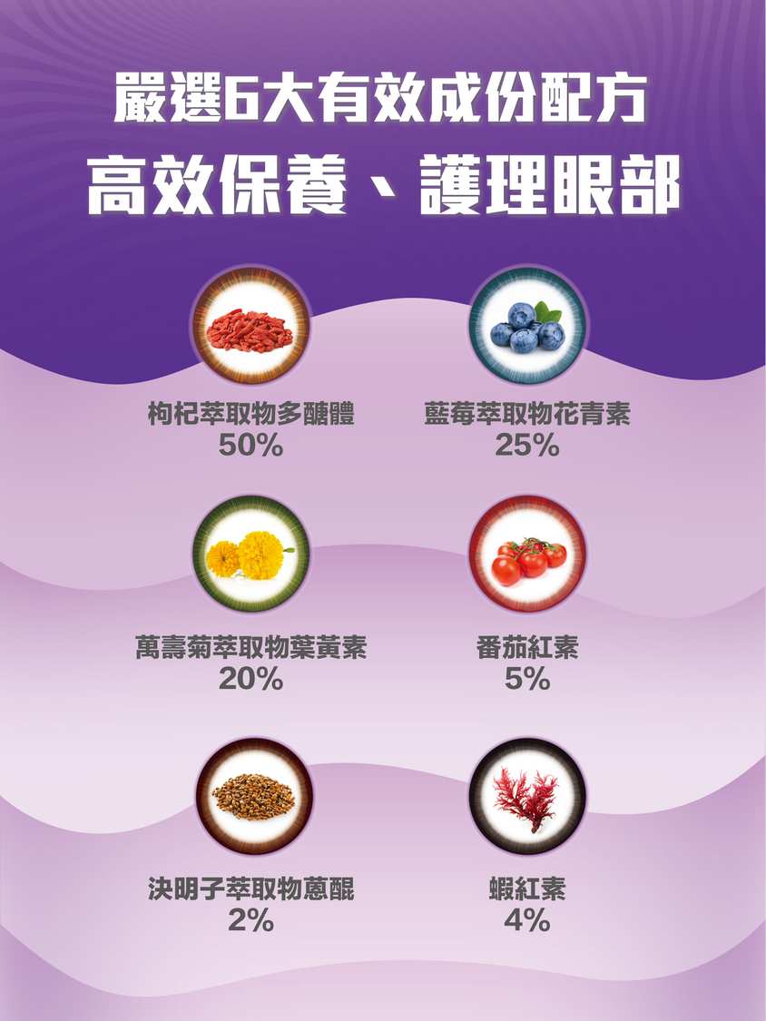 - 提供全面的眼睛健康支持,減輕視力疲勞、保護視網膜及抵禦自由基損傷