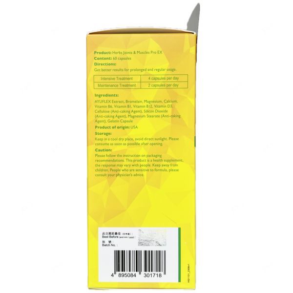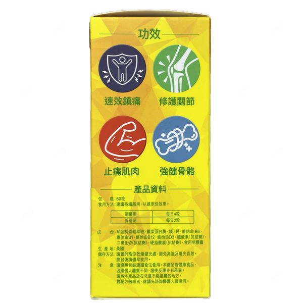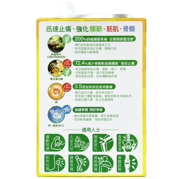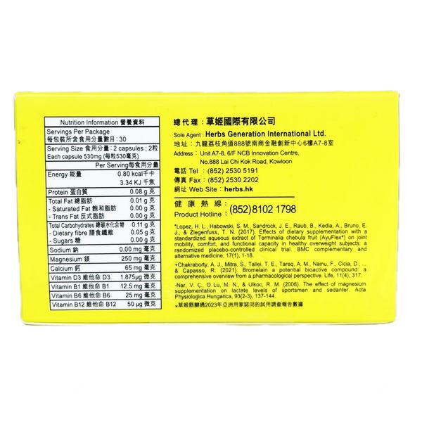 印度訶梨勒萃取,鳳梨蛋白酶,鎂,鈣,維他命 B6,維他命 B1,維他命 B12,維他命 D3,纖維素(抗結劑),二氧化矽(抗結劑),硬脂酸鎂(抗結劑),食用明膠囊
