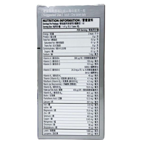 維他命A 2500IU,維他命C 135毫克,維他命D 500IU,維他命E 54IU,維他命K1 45微克,維他命B1 4.1毫克,維他命B2 4.1毫克,菸鹼酸14.4毫克,維他命B6 11毫克,葉酸510膳食葉酸當量微克,維他命B12 41 微克,生物素48.6微克,泛酸12.2 毫克,鈣207 毫克,鐵3.6 毫克,碘135微克,鎂57.6 毫克,鋅9.9 毫克,硒49.5微克,銅0.4 毫克,錳2.7 毫克,鉻90微克,鉬45微克 ,葉黃素1080微克,茄紅素540微克