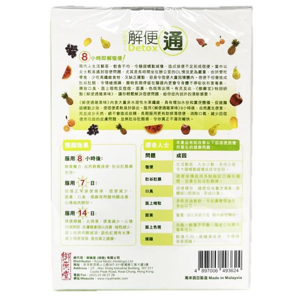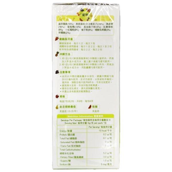 《解便通 雜果味》內含大量水果膳食纖維,具有增加水份和糞便體積、促進腸道蠕動之效,使宿便柔軟易於排出。