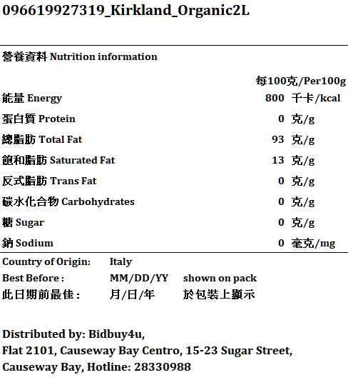 Kirkland-2L裝 有機特級初榨橄欖油 平行進口