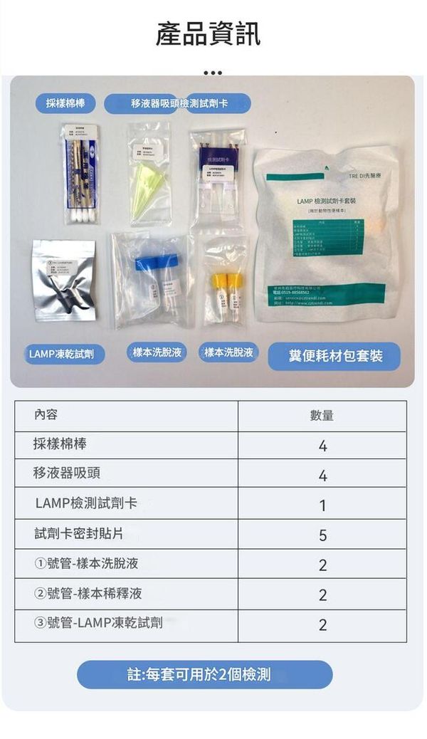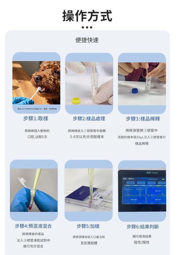 包括一張測試卡及兩個測試劑,每個測試劑可同時檢測犬瘟熱病毒及犬副流感病毒