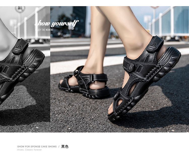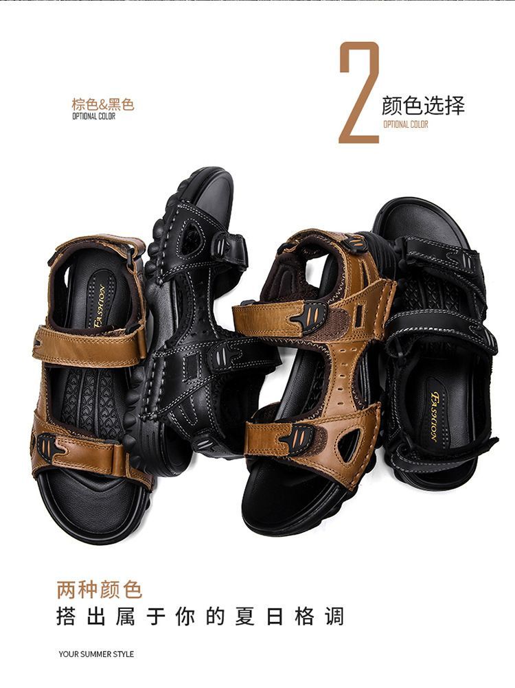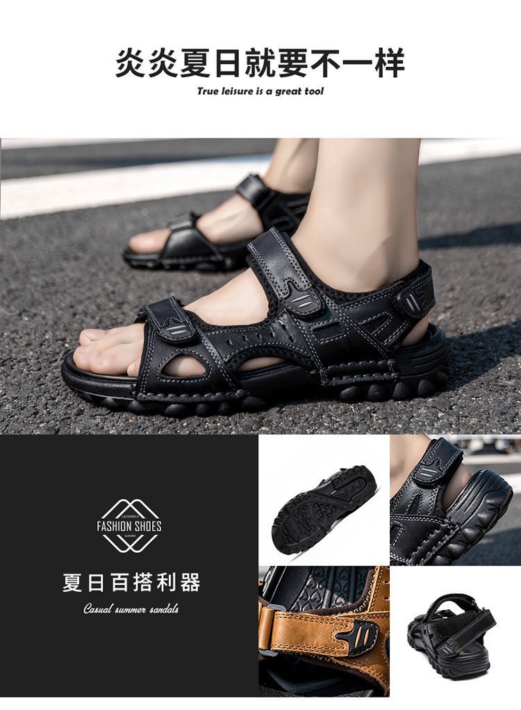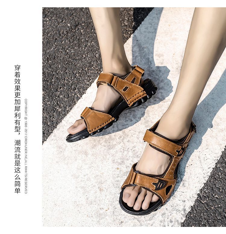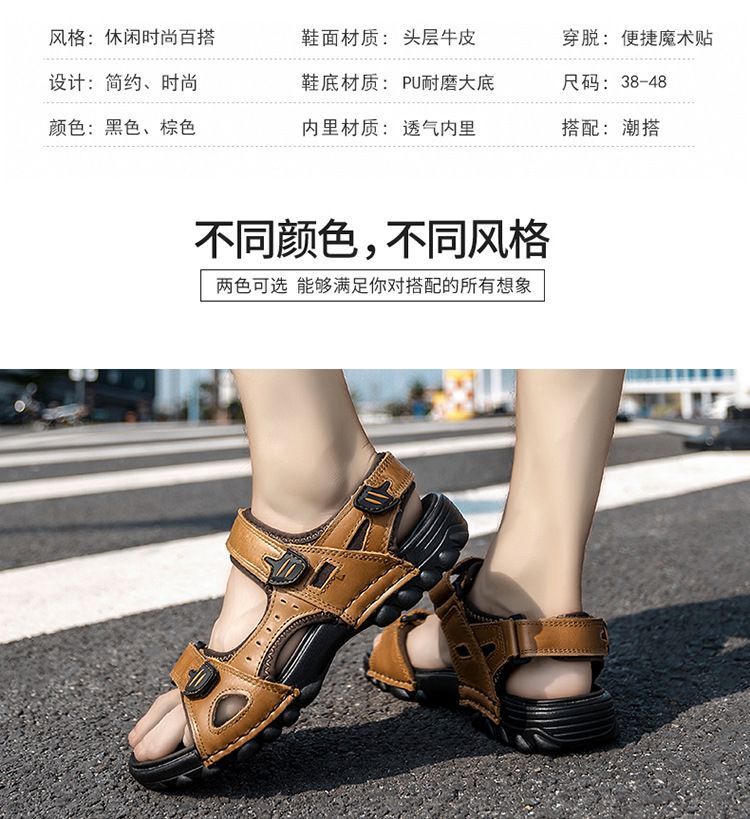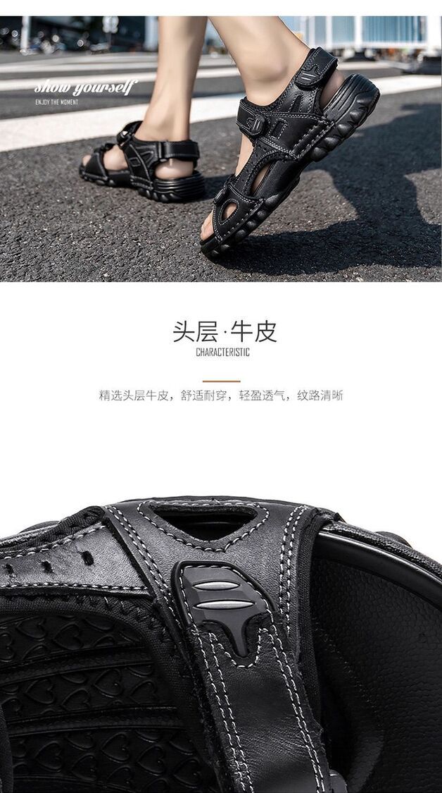 Others-夏季涼鞋男露趾頭層牛皮沙灘鞋男軟底套腳休閒鞋大碼溯溪鞋男透氣