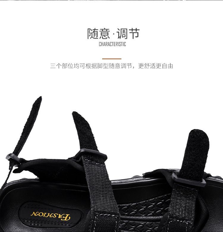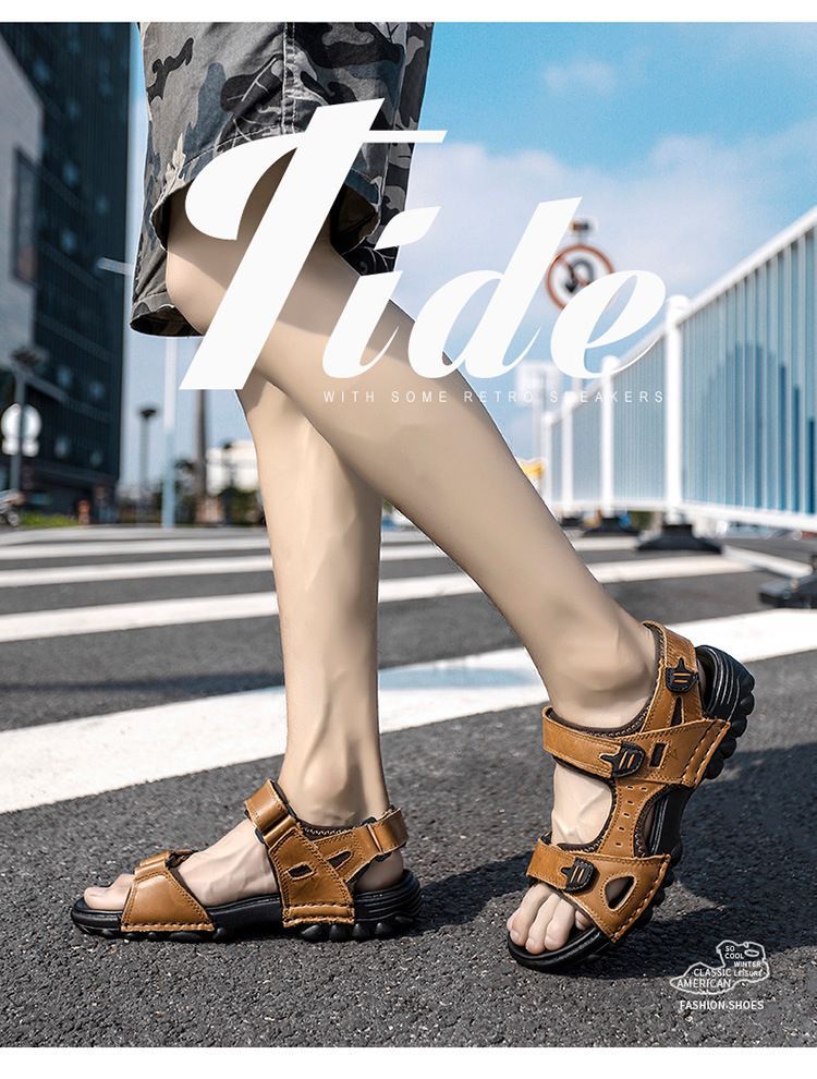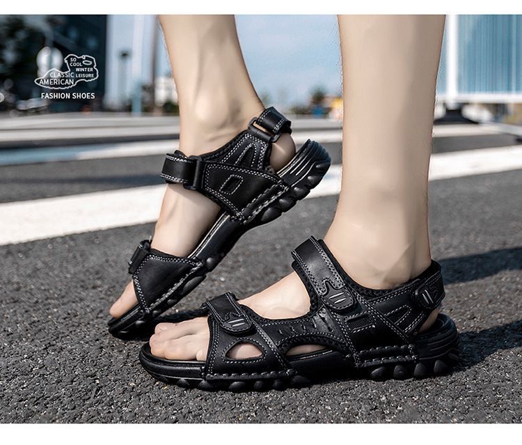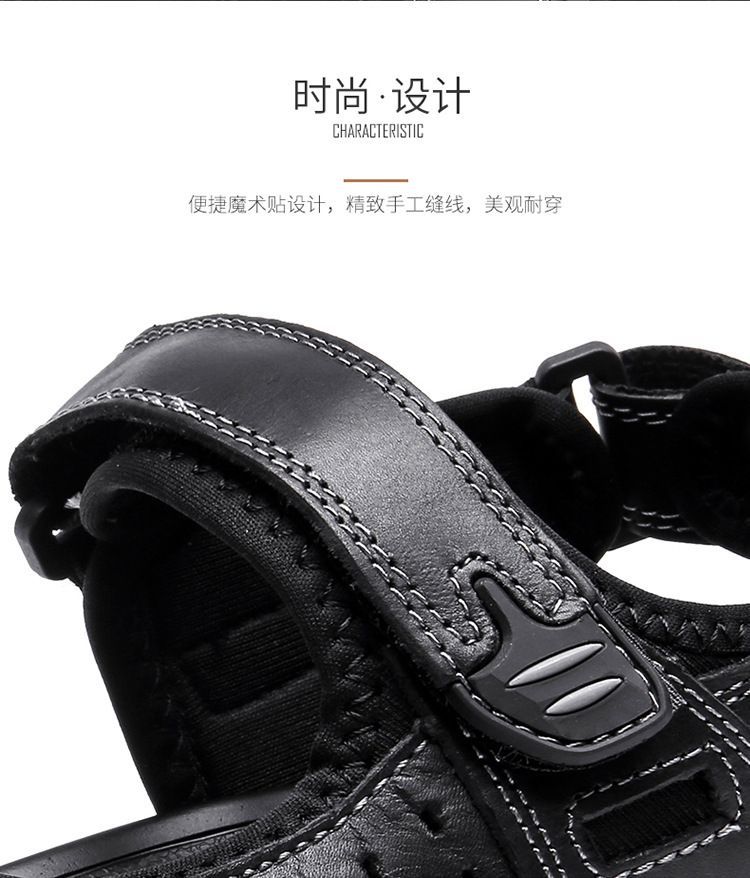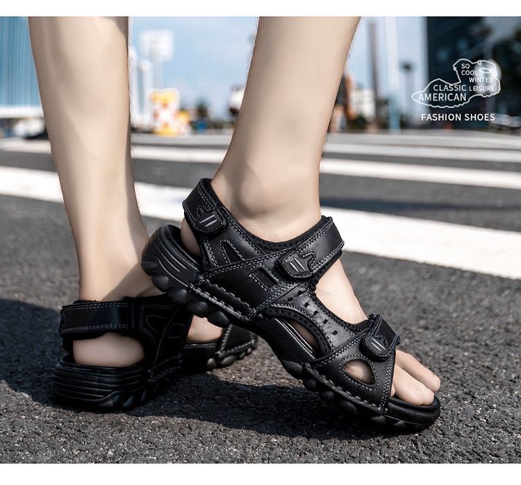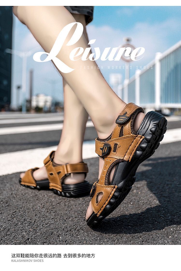 Others-夏季涼鞋男露趾頭層牛皮沙灘鞋男軟底套腳休閒鞋大碼溯溪鞋男透氣