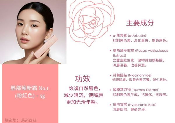 還原嘴唇的自然色澤,減少暗沉,唇部暗沉與唇紋,提供滋潤並提升豐滿度。使嘴唇更加光滑和年輕。