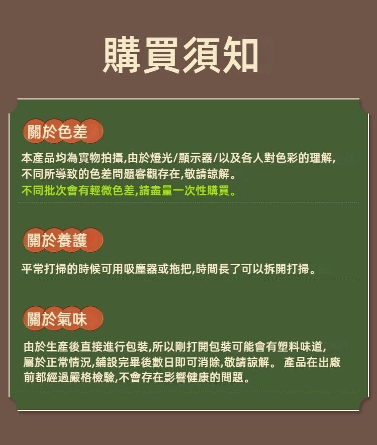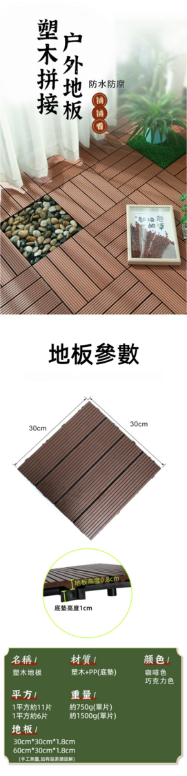 卡扣式簡易安裝,自己動手DIY方便快捷 ,不易變形,防水防火防潮,防腐防蟲,耐曬耐磨,防滑舒適。 ·耐用性高:使用壽命長 ·安全衛生:產品主要採用木質纖維以及PP材質製成,無毒、無味、防水耐濕 ·迅速排水:全天候使用,清洗地板或雨後均無積水存在,維護成本低。 ·方便安裝: 拼裝設計、容易安裝及拆卸,單片損壞可隨意更換。